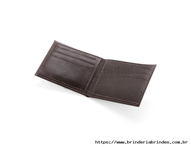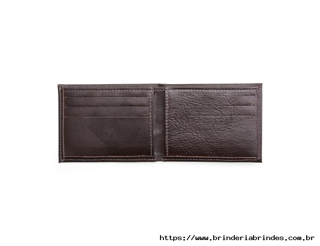 Carteira em couro com design compacto e sem fechamento. Possui seis divisórias internas para cartões e documentos e um compartimento para cédulas.