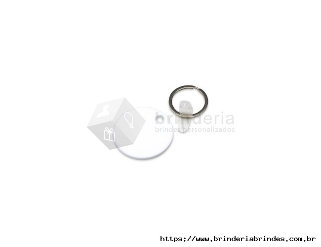Chaveiro de acrílico em formato redondo, frente verso e liso. Possui prendedor de plástico que conecta a argola metálica.