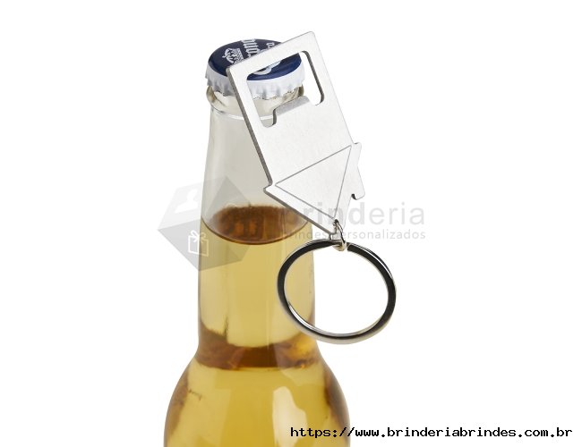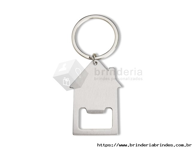 Chaveiro abridor feito em aço inox com formato de uma casa e argola de ferro.