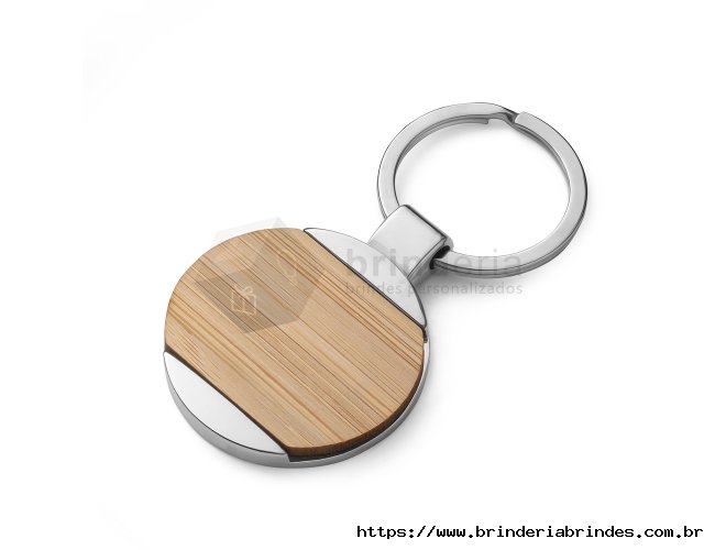 Chaveiro de metal redondo, frente com detalhe de bambu e verso liso.