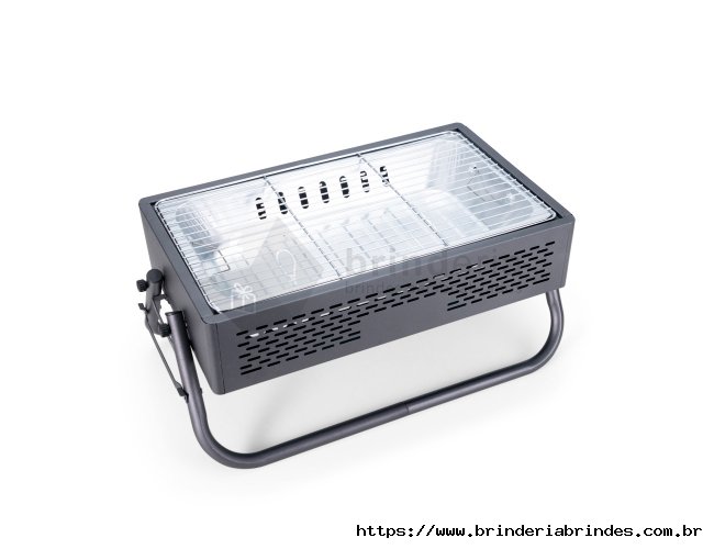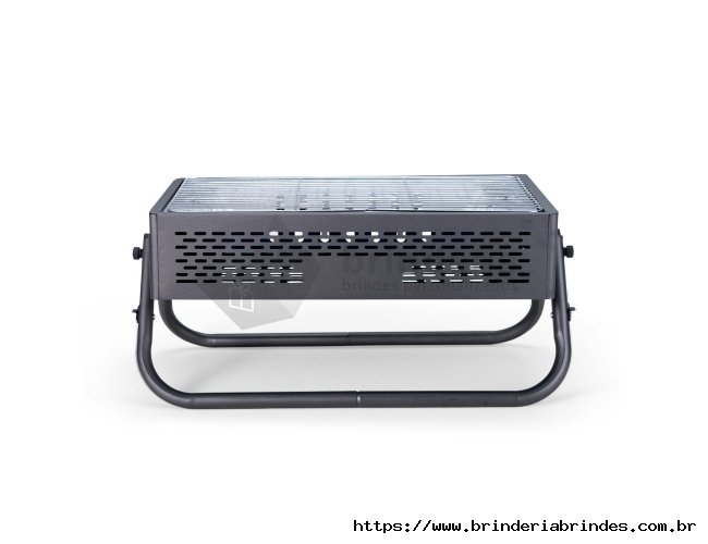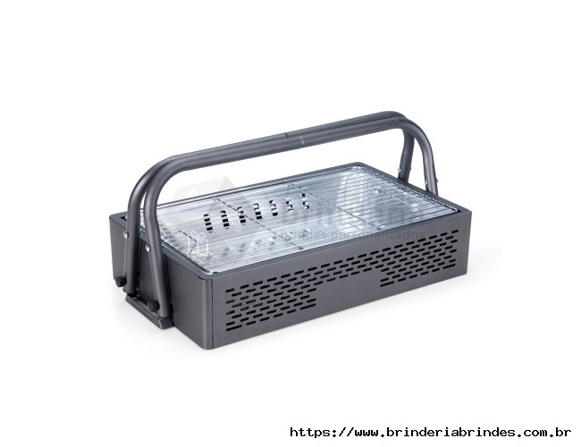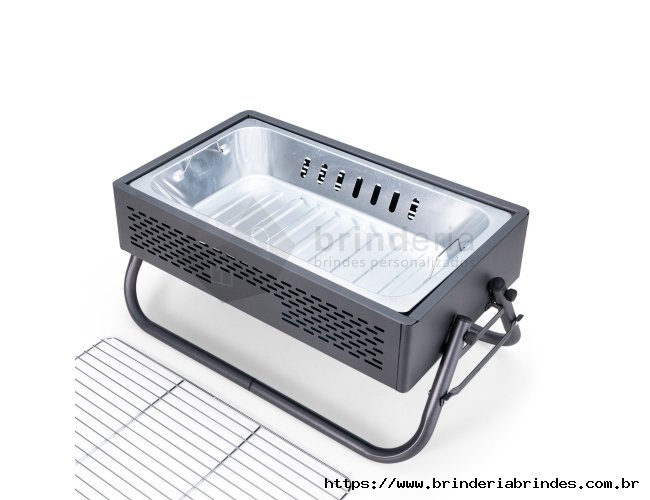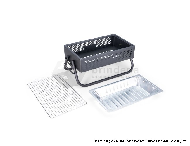 Churrasqueira em ferro com aberturas para ventilação e pés montáveis, que também podem ser utilizados como alças para transporte quando a churrasqueira não estiver em uso. Conta ainda com grelha em metal galvanizado e bandeja metálica com alças removíveis para acomodação do carvão.