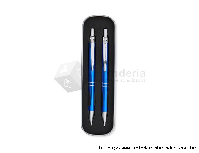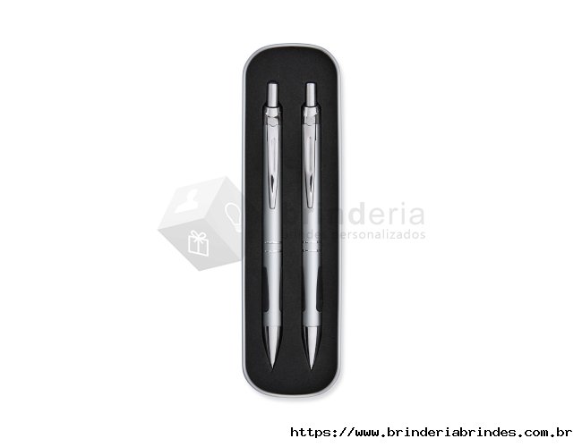Conjunto de caneta e lapiseira metálicas em estojo de metal. Caneta e lapiseira possuem acabamento fosco, detalhe emborrachado na parte inferior, carga esferográfica azul de 1.0mm e acionamento por clique. Estojo revestido em espuma.