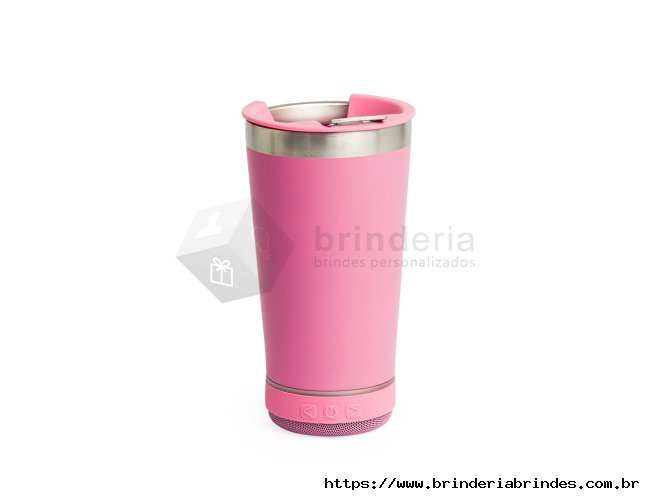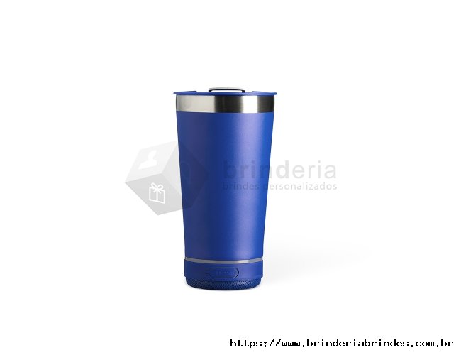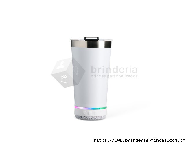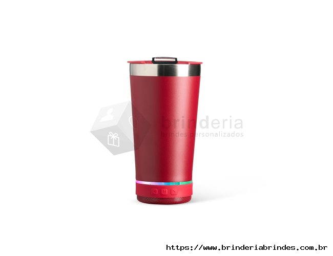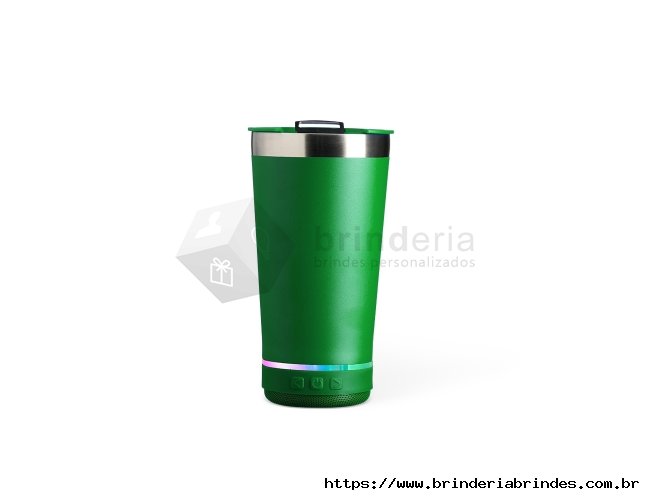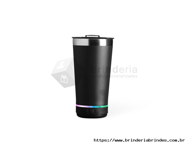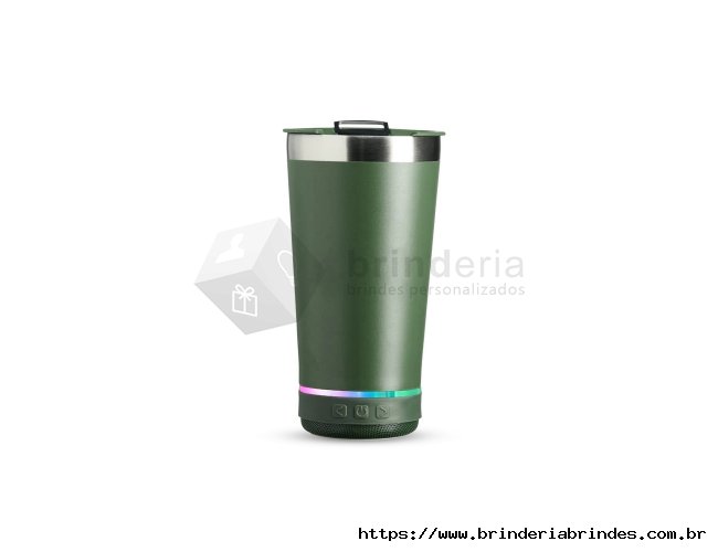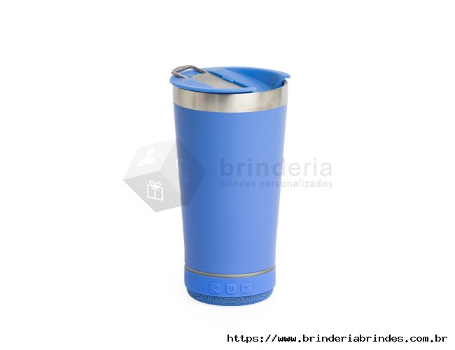 Copo térmico de inox com caixa de som e capacidade 400ml. Contém tampa com abridor. Caixa de som possui botão para ligar/desligar, botões para aumentar diminuir volume/ avançar e retroceder faixas. Operante no modo bluetooth e entrada TF (cartão MicroSD). Acompanha cabo USB Tipo-C. Obs.: A caixa de som não é a prova dágua, para a higienização do copo é necessário desrosquear a caixa de som para remove-la.
