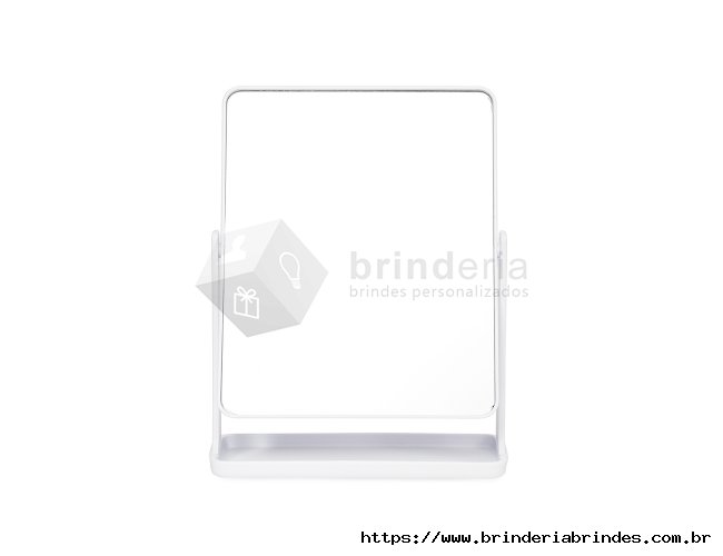 Espelho de mesa giratório retangular sem aumento. Possui estrutura em plástico e base com espaço para organizar pequenos objetos.