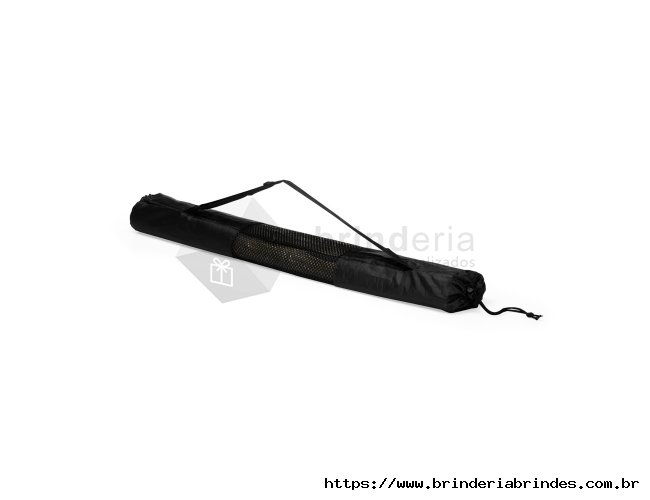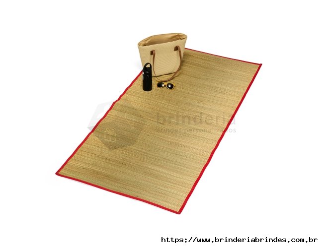 Esteira leve feita em palha natural com bordas costuradas em nylon. Acompanha saco de nylon com seção telada, cordão de fechamento e alça regulável para transporte.