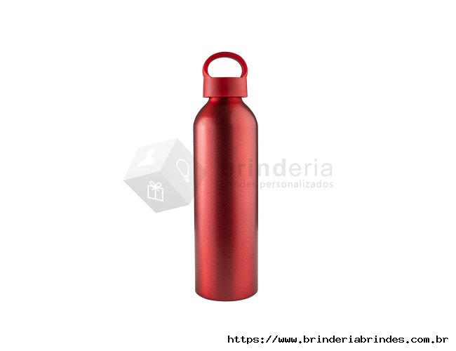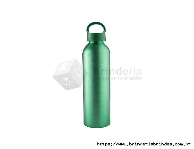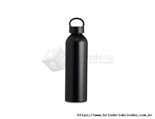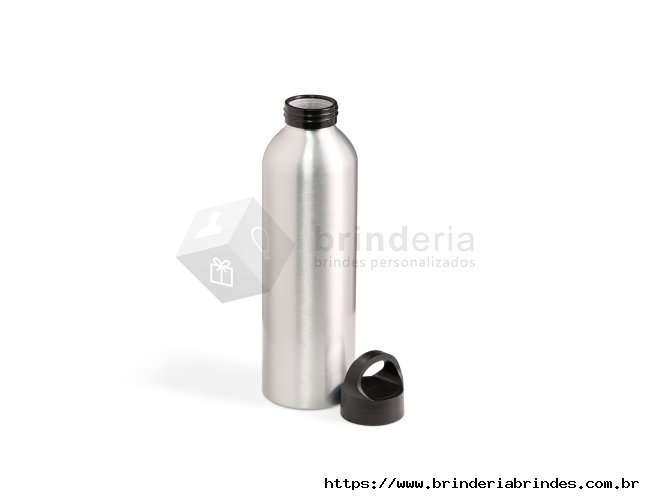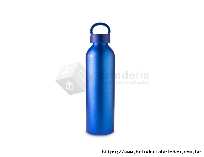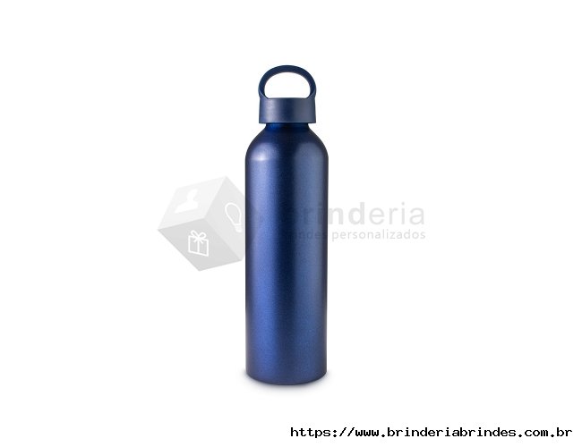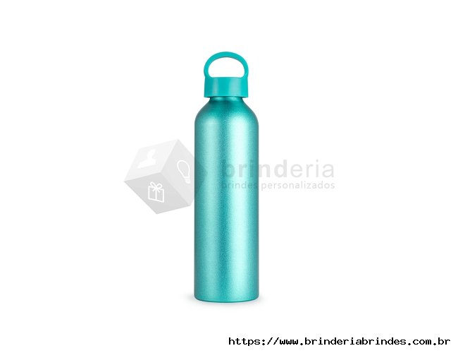 Garrafa de alumínio 630ml. Possui tampa plástica rosqueável com alça integrada.