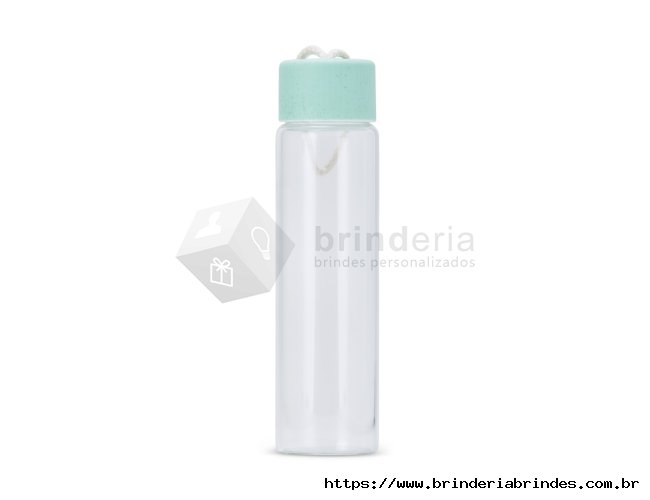 Garrafa de vidro 330ml com tampa plástica e alça de algodão para transporte.