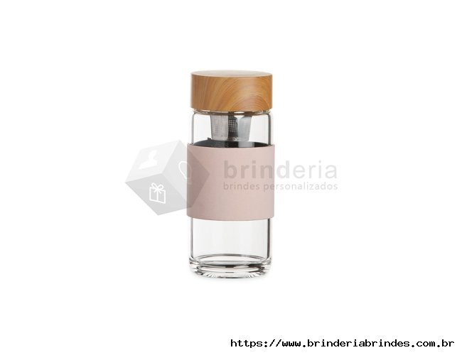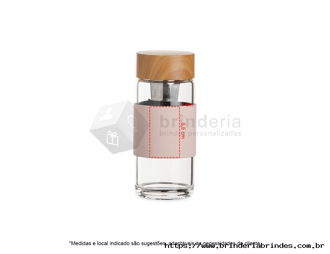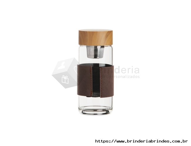 Garrafa de vidro borossilicato com capacidade de 400ml, acompanha infusor e luva de tecido sintético. Tampa de bambu.