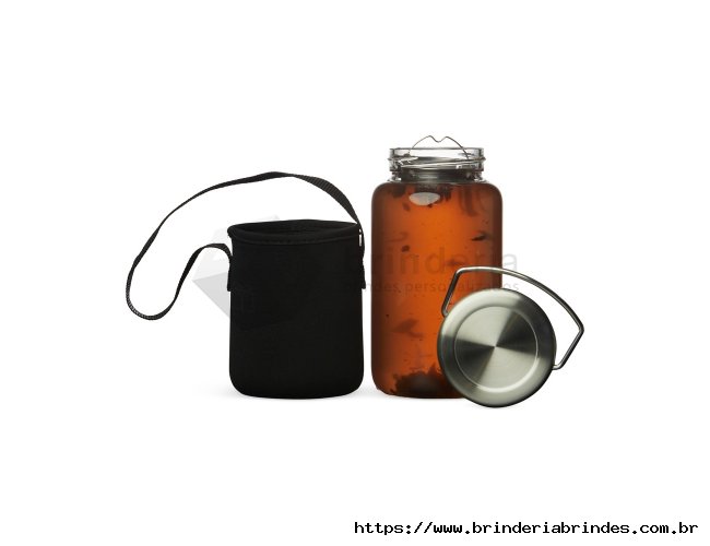 Garrafa de vidro borossilicato com capacidade de 650ml, acompanha peneira infusora e capa de neoprene com alça para transporte. Tampa de alumínio com alça para transporte.