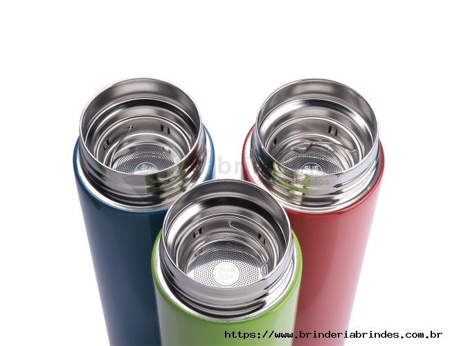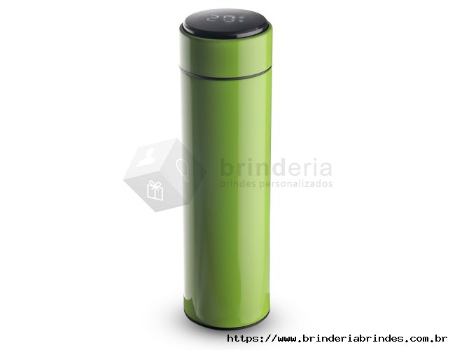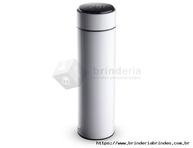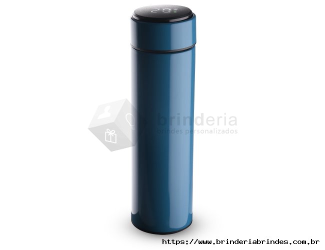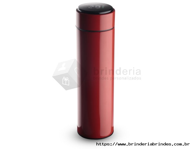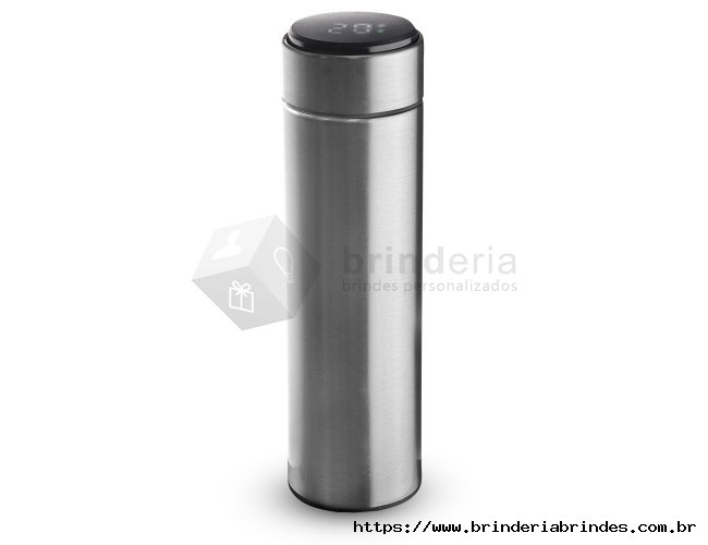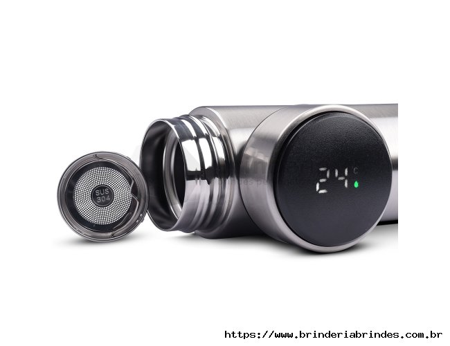 Garrafa inox 450ml com parede dupla, infusor e display LED com termômetro digital na tampa para indicar a temperatura do líquido. Conserva temperatura quente ou fria.