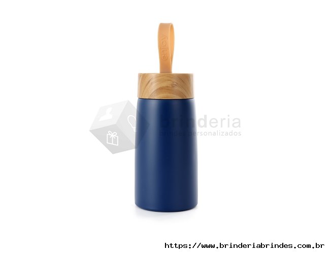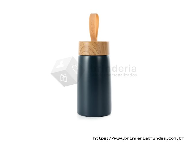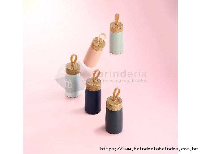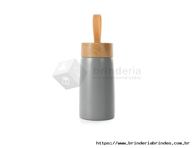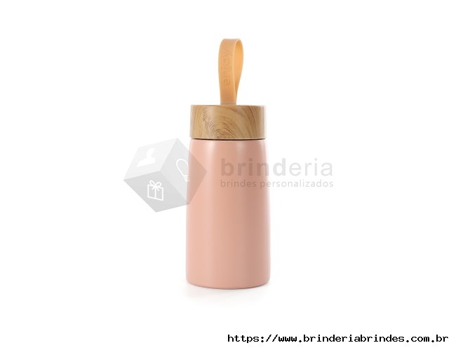 Garrafa inox 304 com parede dupla, capacidade de 250ml. Contém tampa plástica com design de bambu e alça de silicone para transporte.
