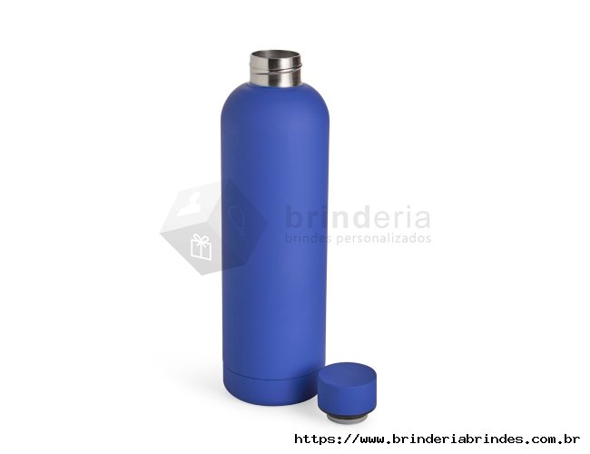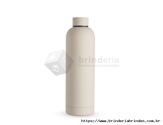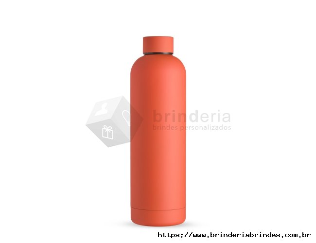 Garrafa térmica em inox 304 com pintura de acabamento emborrachado, estrutura de parede dupla, tampa rosqueável e capacidade para até 750ml.