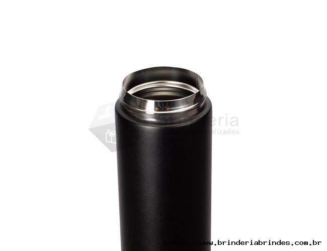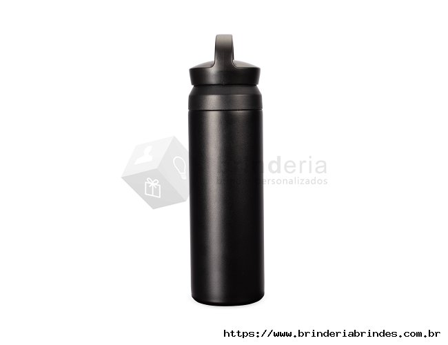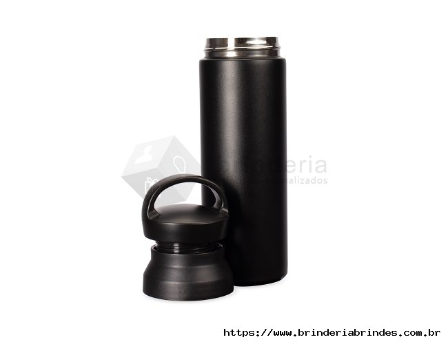 Garrafa térmica com capacidade de até 500ml. Conta com estrutura de parede dupla e isolamento a vácuo, o que permite a conservação da temperatura de bebidas por mais tempo. Possui tampa plástica rosqueável com alça para transporte e abertura em duas camadas.