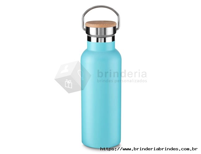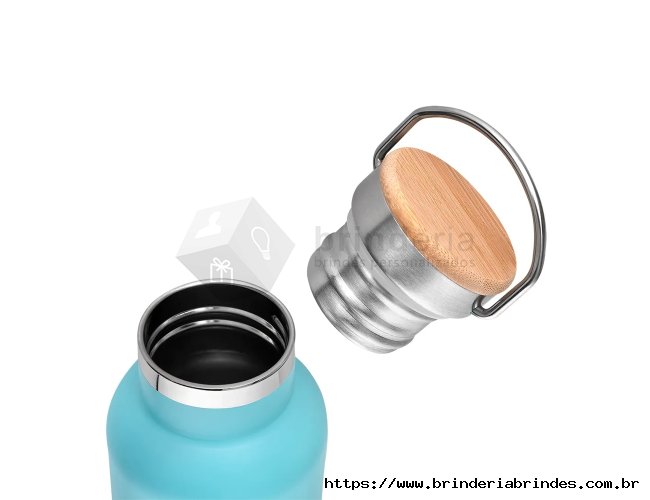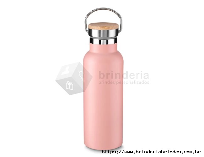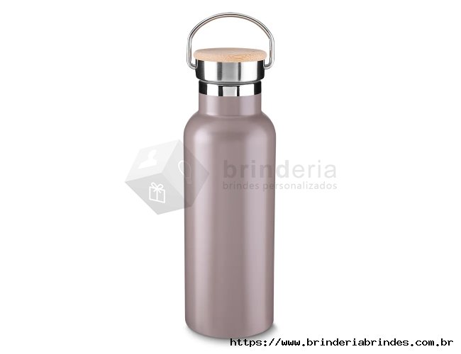 Garrafa térmica em inox 500 ml, tampa rosqueável com revestimento em fibra de bambu, alça de metal.