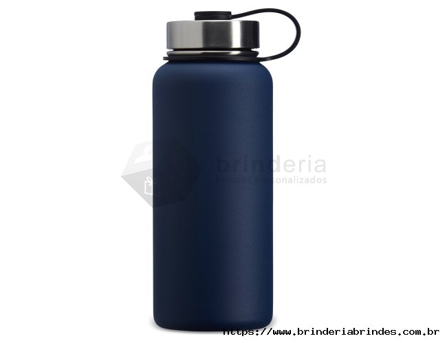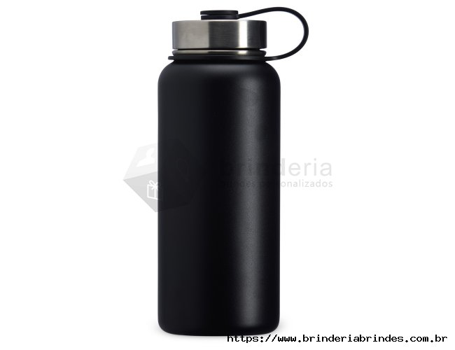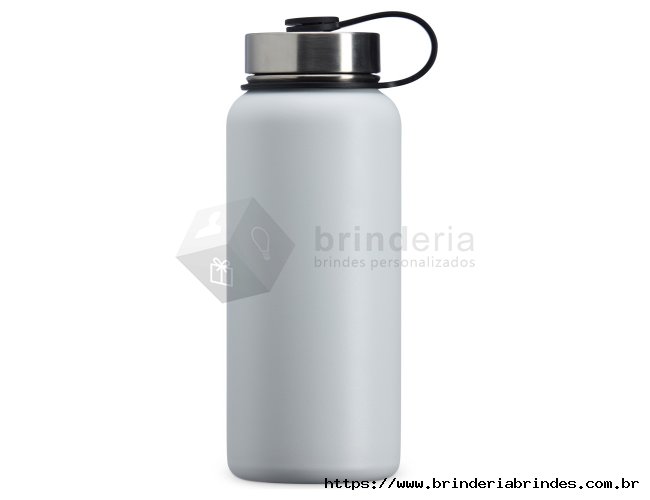 Garrafa térmica de parede dupla em inox, capacidade de 950ml. Tampa rosqueável com alça para transporte.
