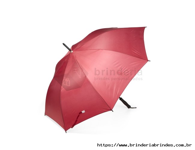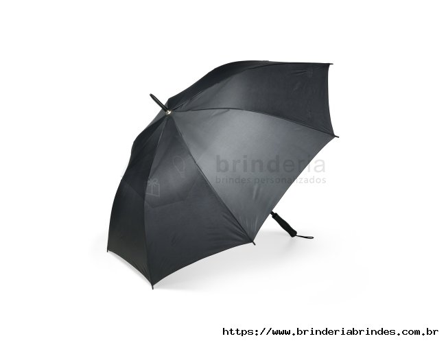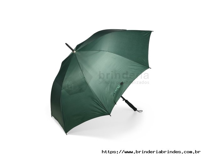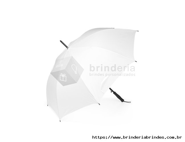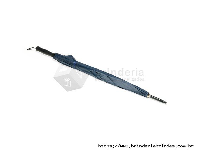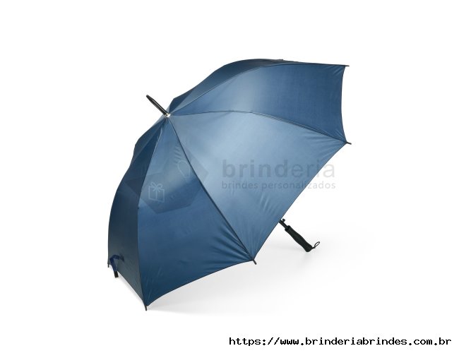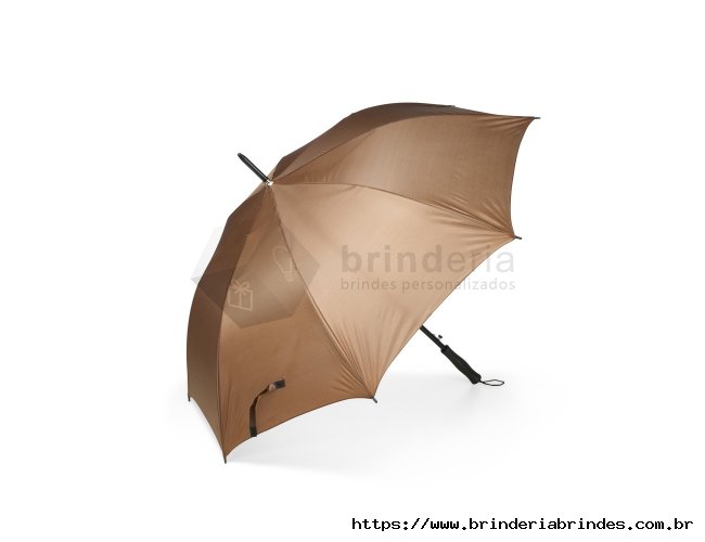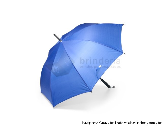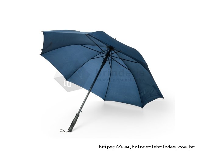 Guarda-chuva em poliéster com abertura automática, estrutura metálica com oito varetas e pegador em plástico com alça de nylon fixa na extremidade.