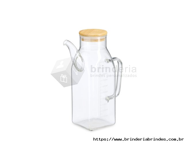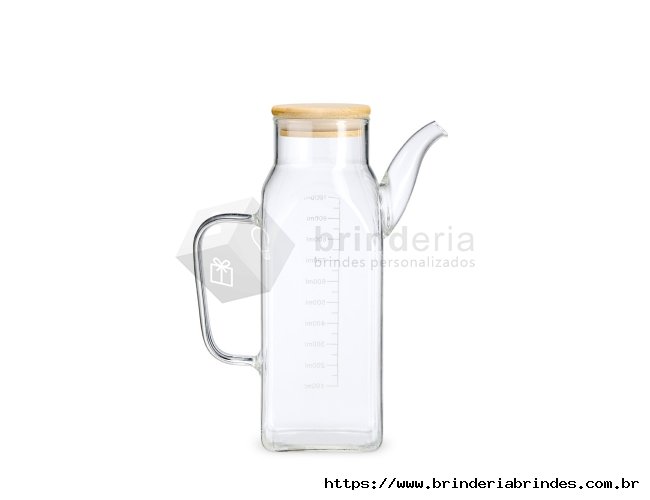 Jarra de vidro borossilicato, material resistente à oscilações de temperatura. Com capacidade para até 1 litro, possui marcação de capacidade no corpo do recipiente e tampa de bambu com anel de vedação. Acompanha tampa protetora para o bico em silicone.
