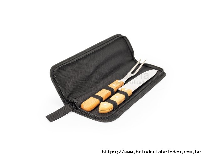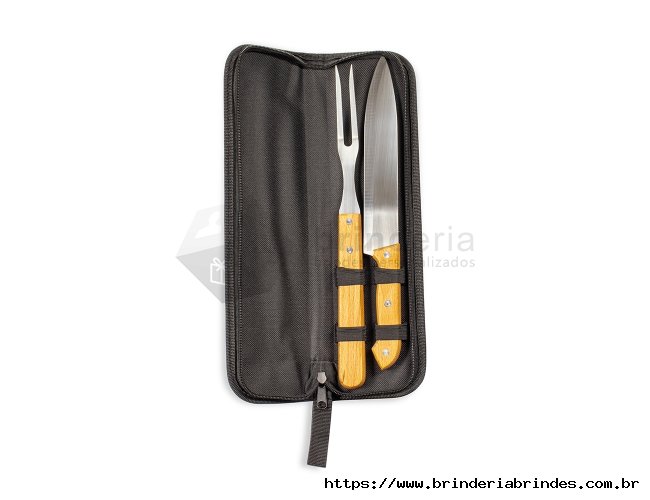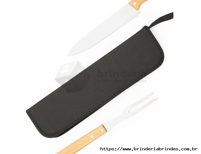 Kit churrasco 2 peças com estojo, contém faca e garfo. Estojo com alça para transporte e área interna com elástico de fixação para os utensílios.