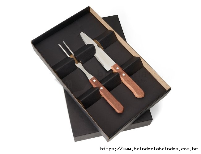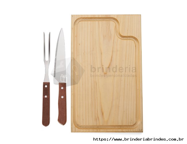 Kit churrasco três peças em estojo de papel kraft, contém: faca, garfo e tábua de corte com canaleta.