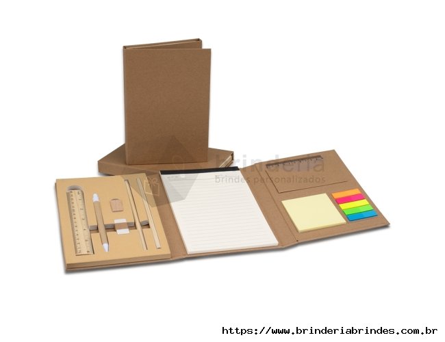Kit ecológico para anotações, com capa kraft. Contém bloco pautado com aproximadamente 40 folhas marfim, bloco autoadesivo com aproximadamente 25 folhas amarelas, conjunto de 5 marcadores plásticos autoadesivos com aproximadamente 25 folhas, régua plástica 10 cm, régua de madeira 15 cm, borracha, apontador, dois lápis e uma caneta esferográfica azul 1.0mm com acionamento por clique.