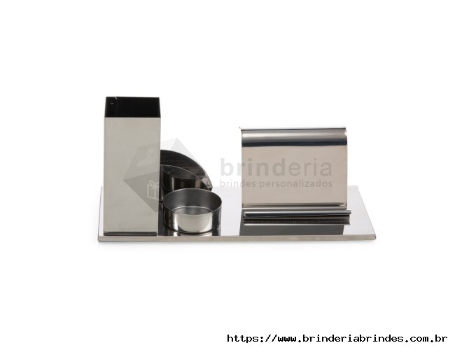 Kit escritório 4 em 1 em inox espelhado. Possui suporte para canetas, cartões, clips e celular.