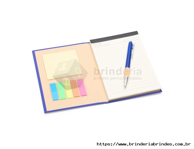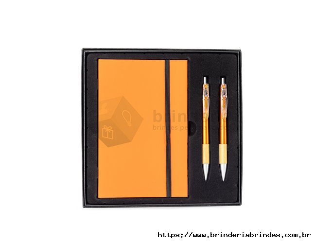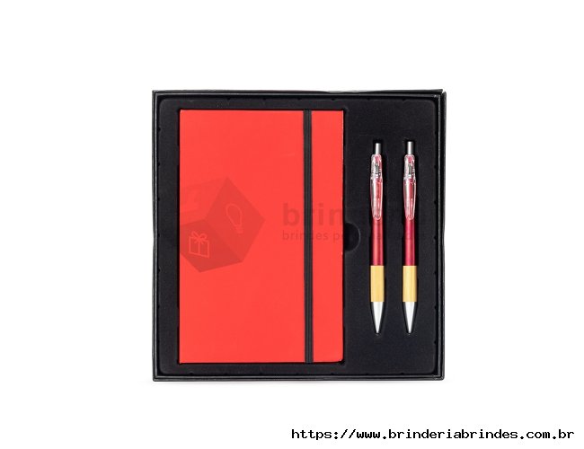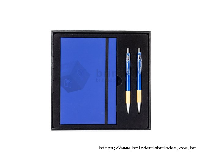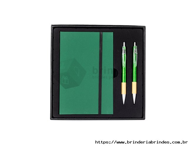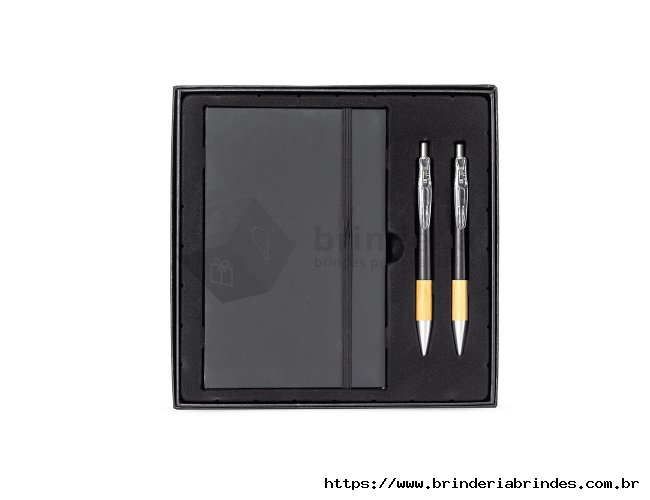 Kit executivo com três peças, composto por uma caderneta, uma caneta e uma lapiseira. A caderneta possui capa dura em papelão reforçado, fechamento em elástico, cerca de 82 folhas pautadas, bloco de folhas amarelas e outro com marcadores autoadesivos coloridos. A caneta e a lapiseira contam com corpo em plástico e detalhes em bambu. Além disso, a caneta possui carga esferográfica azul de 1,0 mm, enquanto a lapiseira dispõe de grafite de 0,7 mm. Acompanha caixa em papelão com berço em plástico para guardar os itens do conjunto.