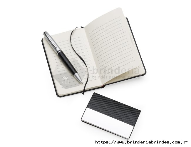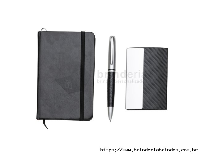 Kit executivo 3 peças em estojo de papelão com tampa e parte interna revestida de espuma. Contém: porta cartão de couro sintético texturizado com detalhes prata brilhante, caneta metal fosca com detalhe emborrachado preto, caderneta em couro sintético com aproximadamente 80 folhas amarelas pautadas. Acompanha placa metálica para gravação.