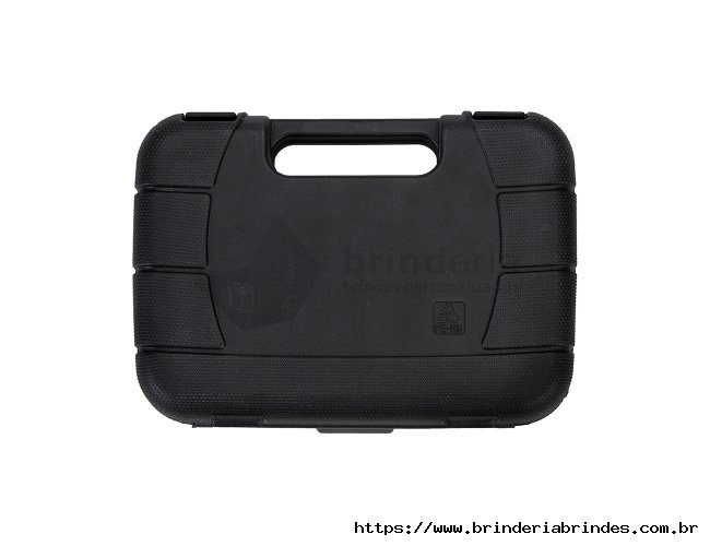 Kit ferramenta 8 peças em estojo plástico. Maleta plástica com detalhe retangular no centro frontal e verso liso, possui texturização no estojo e duas travas superiores. Acompanha: fita isolante, martelo, alicate, chave Philips, chave teste, chave de fenda, trena 2 metros e estilete.