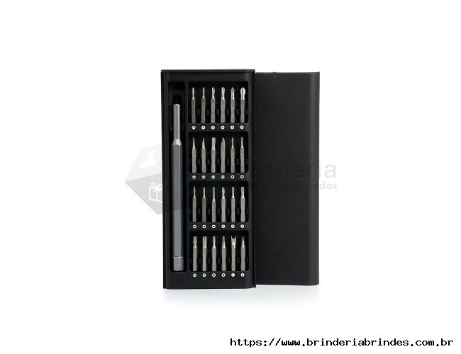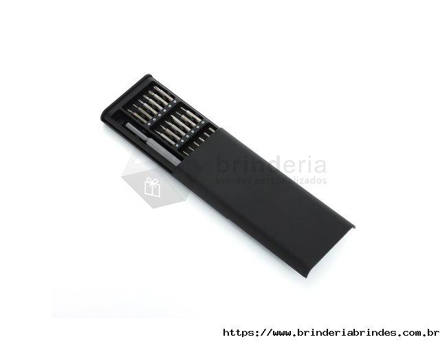 Kit ferramenta com 25 peças em estojo plástico com tampa de encaixe. Contém: 1 chave extensora rotatória para conexão das ponteiras, 1 ponteira Tri-Wing, 5 ponteiras Phillips, 4 ponteiras fenda, 10 ponteiras Torx, 2 ponteira Allen, 1 ponteira spanner e 1 ponteira fenda triangular.