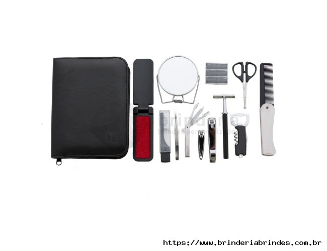 Kit masculino 12 peças em estojo de couro sintético, parte interna revestida com plástico em relevo e elástico para fixação dos itens. Possui: removedor de pelos, abridor saca rolha, tesoura, aparelho de barbear, lâminas para barba(3 unidades), escova de dente, pente, cortador de cutícula, mini kit unha 3 em 1(empurrador de cutícula, lixa, limpador de unha), cortador de unha, pinça e espelho duplo com aumento.