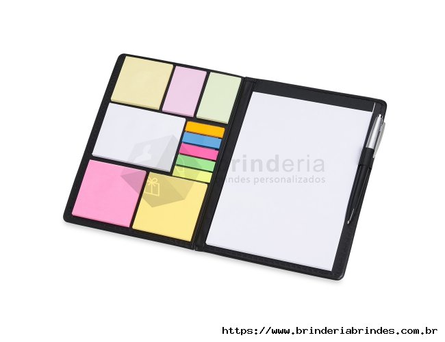 Kit para anotações em couro sintético com autoadesivos e caneta plástica. Contém seis blocos com aproximadamente 50 folhas, conjunto de cinco marcadores plásticos autoadesivos com aproximadamente 26 folhas, bloco A5 com aproximadamente 50 folhas e caneta esferográfica com carga azul e acionamento por clique.