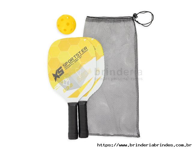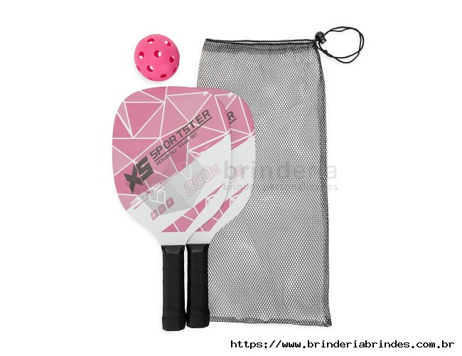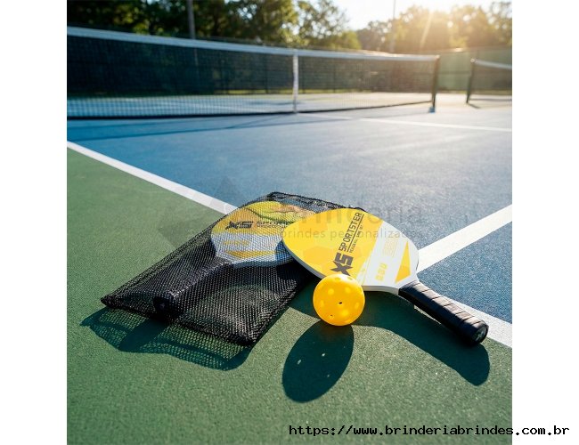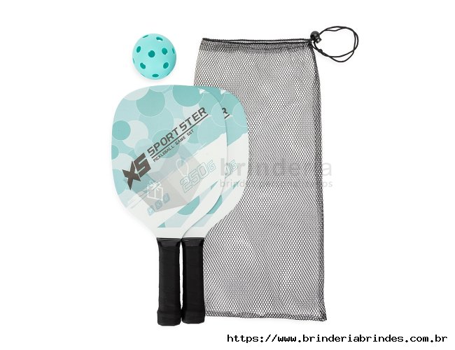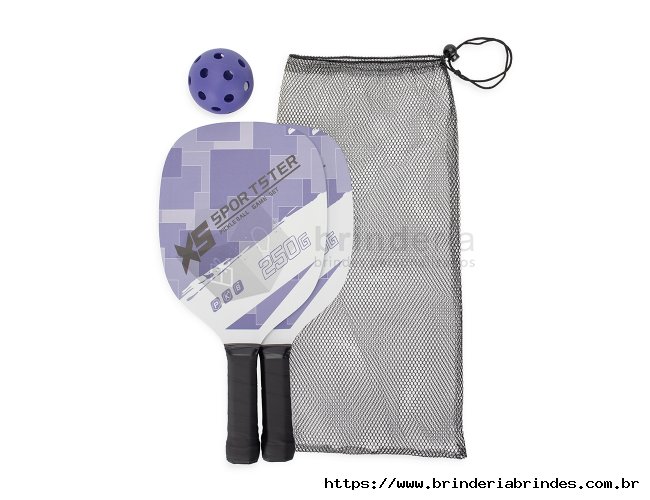 Kit Pickleball composto por 2 raquetes de madeira, cada uma com um lado personalizado e outro liso, além de grip composto em fibras de carbono e vidro. Acompanha 1 bola plástica com 26 furos e um saco telado para transporte.