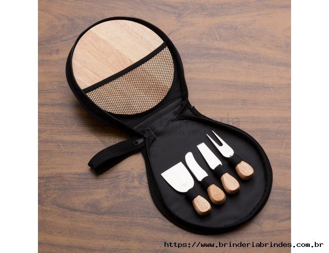 Kit queijo 5 peças em estojo de nylon com zíper e alça. Contém: espátula grande, garfo, faca reta, espátula pequena e tábua de bambu. Estojo com rede interna para guardar a tábua e velcro para ficar as peças.