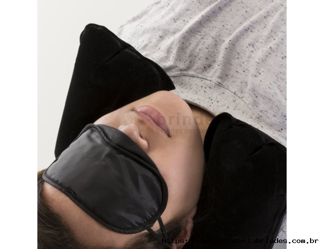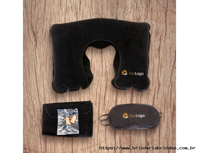 Kit viagem com 3 peças, contém: travesseiro inflável(revestido de veludo), máscara para olhos de cetim(revestido com espuma) e um par de protetor auricular. Travesseiro colorido, máscara sempre preta e proteror sempre laranja. Acompanha uma necessaire colorida de veludo para guardar o kit.