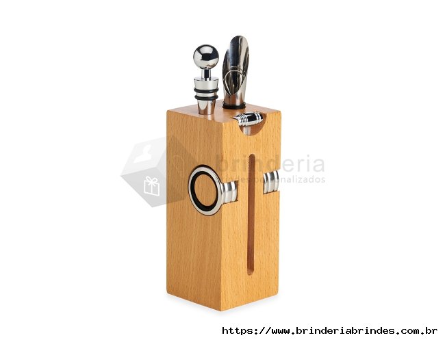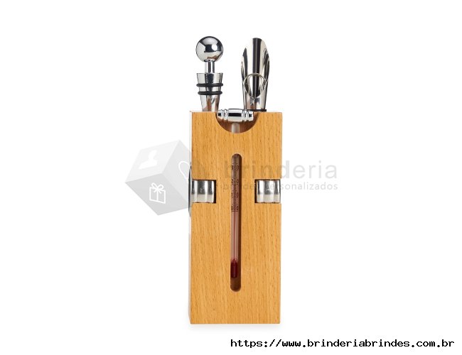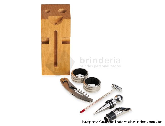 Kit vinho 6 peças em cepo de madeira, contém tampa de bico, bico condutor com tampa, termômetro, dois wine collars e saca rolhas metálico com abridor e lâmina de corte.