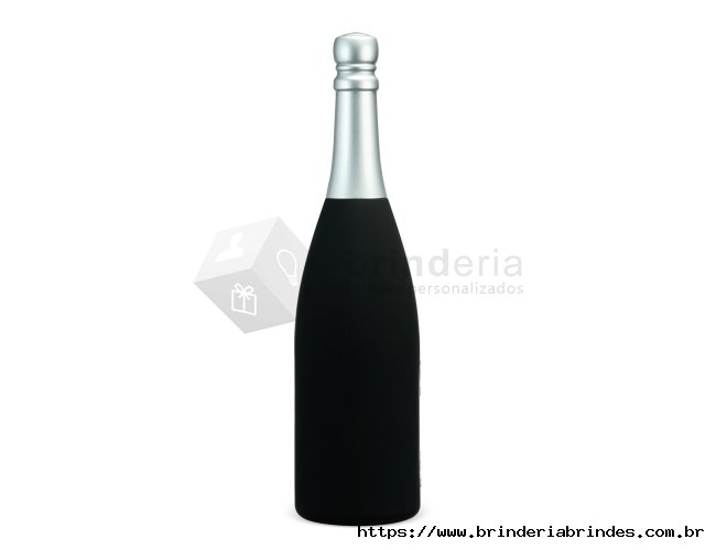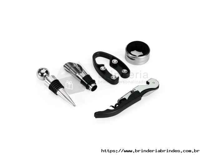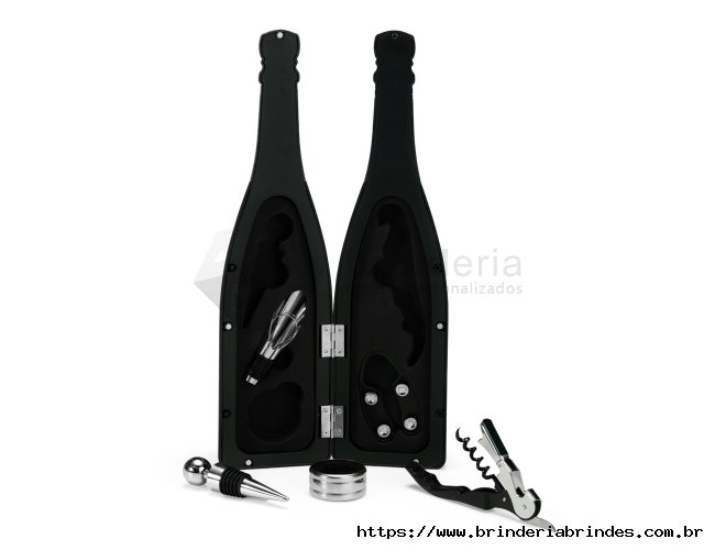 Kit vinho com cinco peças dispostas em um estojo no formato de garrafa, fechamento imantado e interior com berço em espuma. O conjunto contém: tampa de bico, bico condutor com tampa, saca-rolhas metálico três em um com lâmina de corte e abridor de garrafa, um wine collar e cortador de lacre.