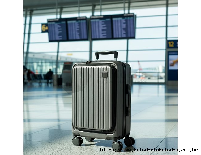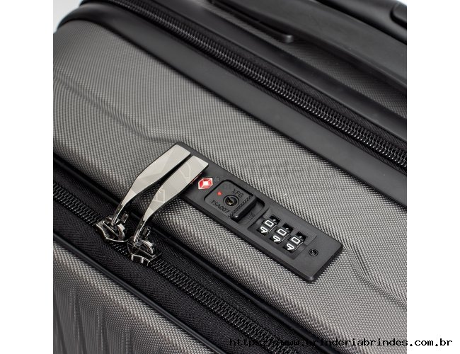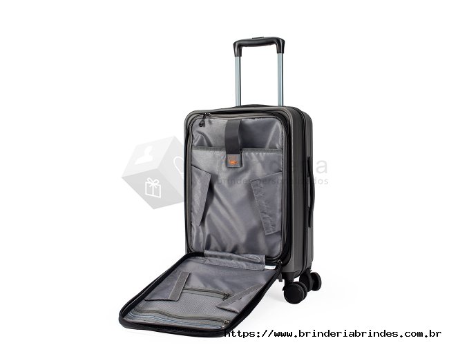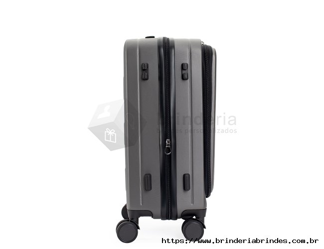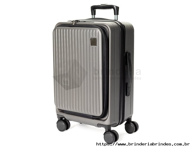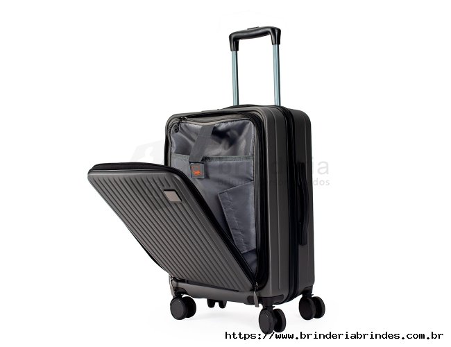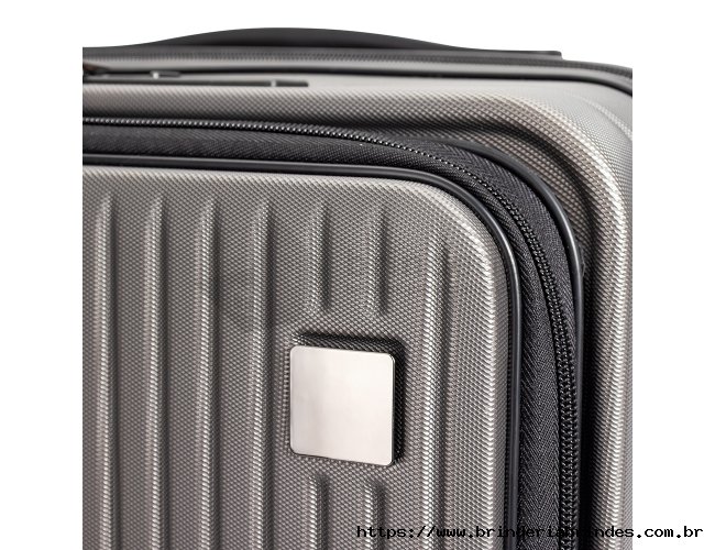 Mala de viagem feita em ABS com capacidade de até 33 litros quando o zíper externo de expansão é aberto. Possui abertura frontal com bolsos de zíperes, uma divisória para notebooks de até 15,6 polegadas e cinta compressora para roupas. Conta ainda com cadeado TSA embutido na parte superior, quatro rodinhas giratórias 360°, duas alças de mão, além de apoios e ganchos laterais. Acompanha placa metálica personalizável.