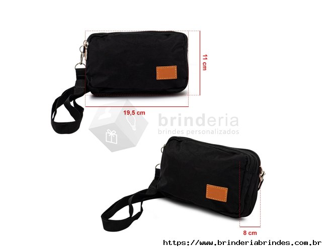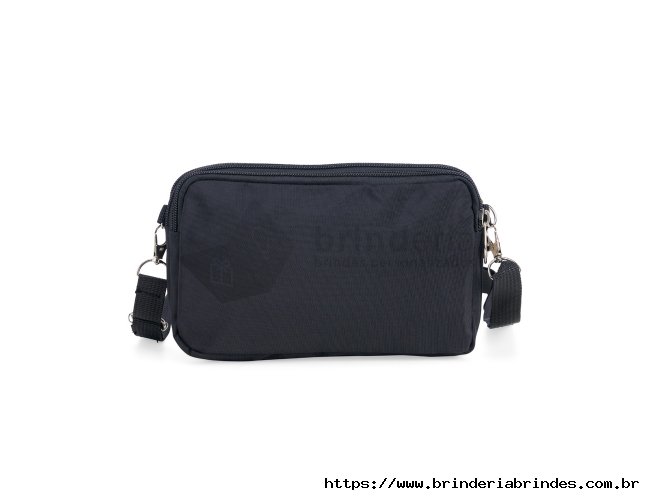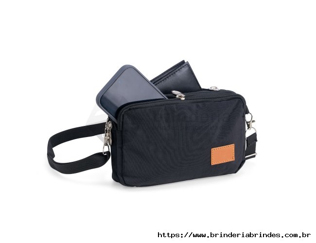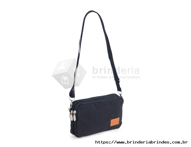 Bolsa de ombro em nylon resistente à água, com três compartimentos, alça regulável e etiqueta com espaço para personalização em couro sintético. Executando o papel de ser um bolso extra para guardar e encontrar rapidamente os acessórios do dia a dia.