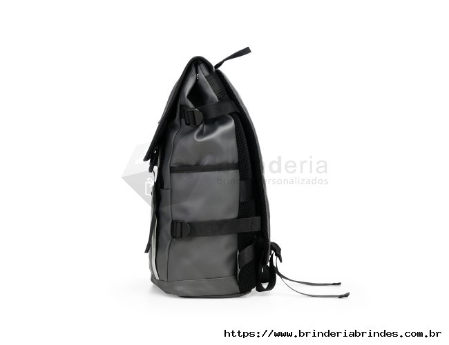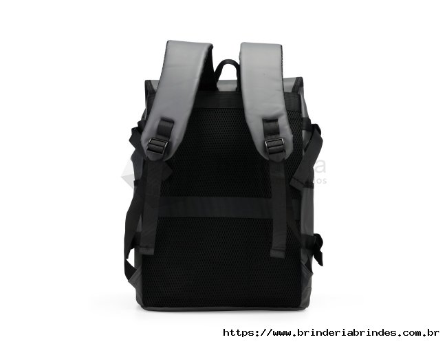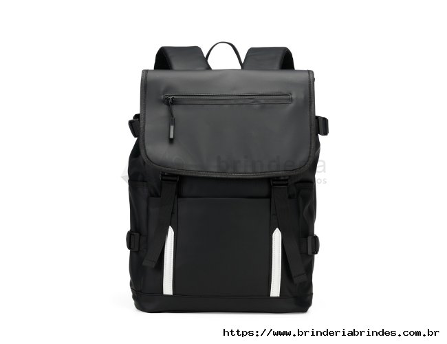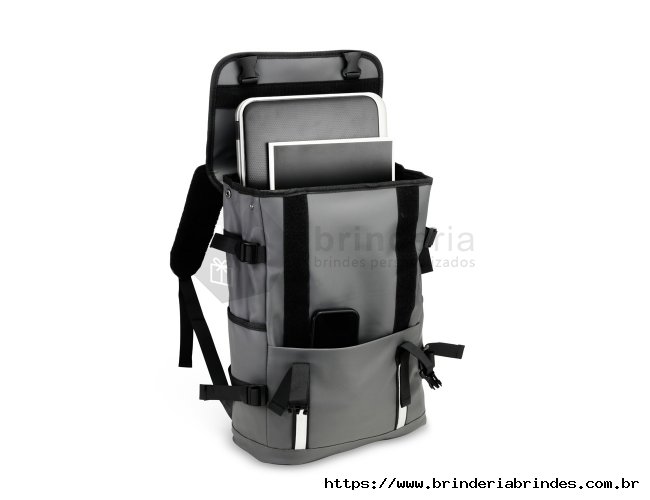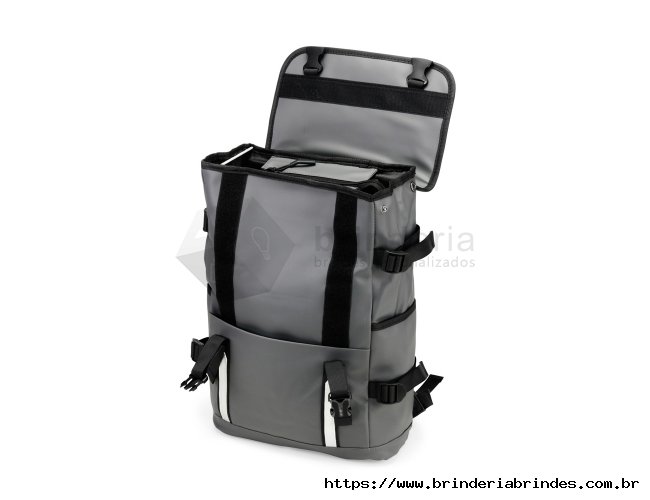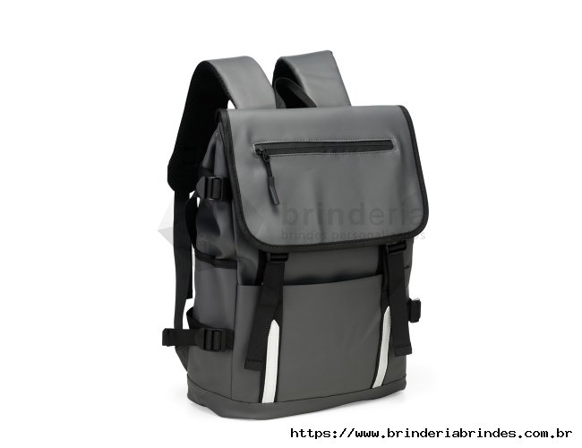 Mochila confeccionada em couro sintético com capacidade máxima de 18 litros. Possui abertura com zíper, tiras frontais em velcro e engate rápido. Apresenta divisória interna para notebook de até 15,6 polegadas, além de dois bolsos laterais e dois frontais, sendo um com fechamento em zíper próximo à abertura. Conta ainda com alças ajustáveis, costas acolchoadas em espuma respirável e engate traseiro para malas.