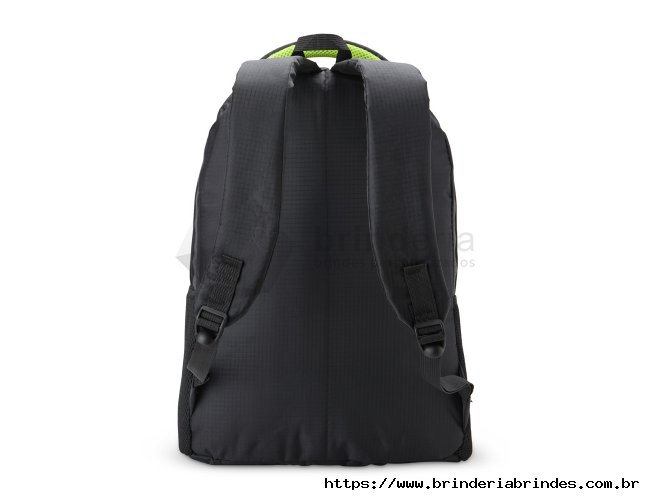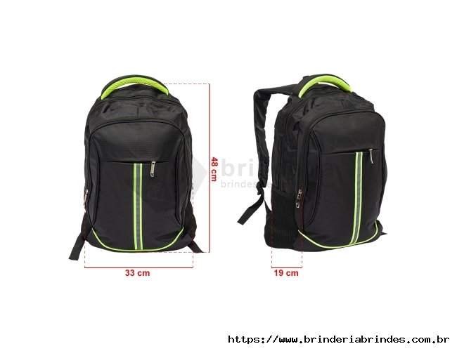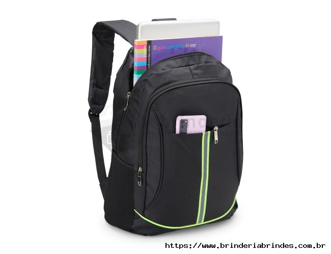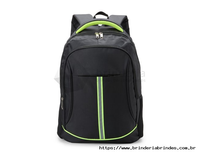 Mochila de nylon 26 Litros com três compartimentos, sendo o principal com bolso para notebook de 15,6. A mochila possui bolsos laterais em malha e faixa reflexiva na parte frontal.