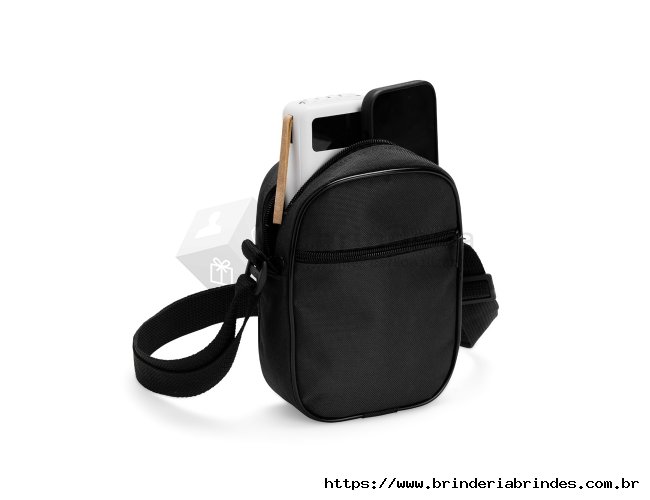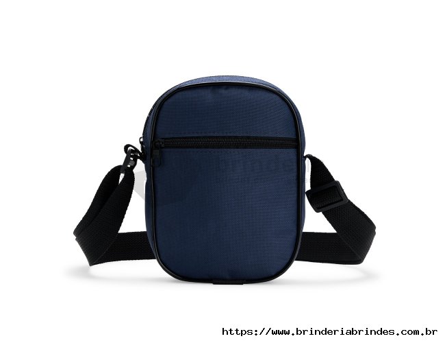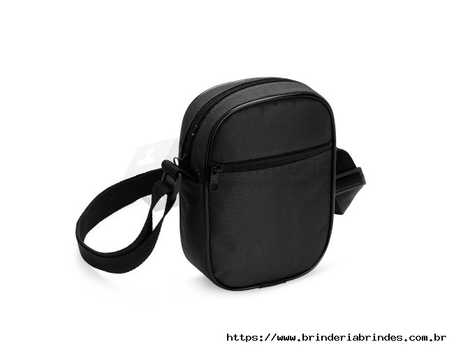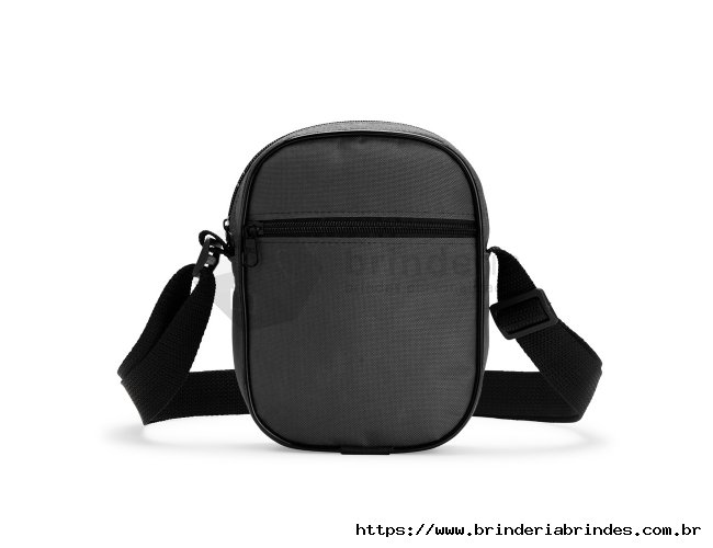 Bolsa de ombro confeccionada em poliéster resistente à água e alça de nylon ajustável. Possui compartimento interno com fechamento em zíper e dois bolsos externos: um aberto e outro com zíper.