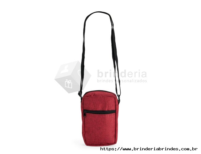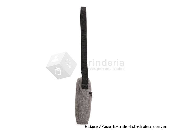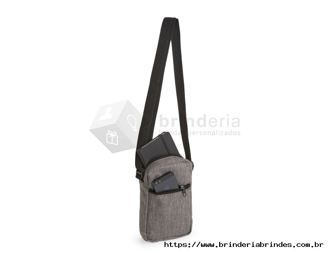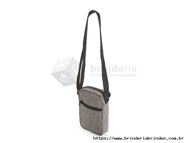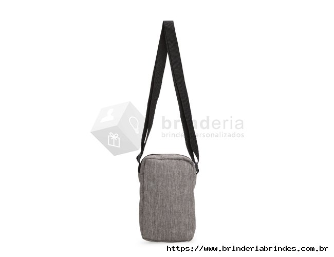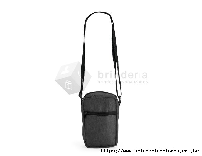 Bolsa de ombro resistente à água, confeccionada em poliéster mesclado com PVC, com fechamento em zíper e alça ajustável. Possui divisória em tela de nylon no compartimento interno e um bolso frontal para a organização de objetos.