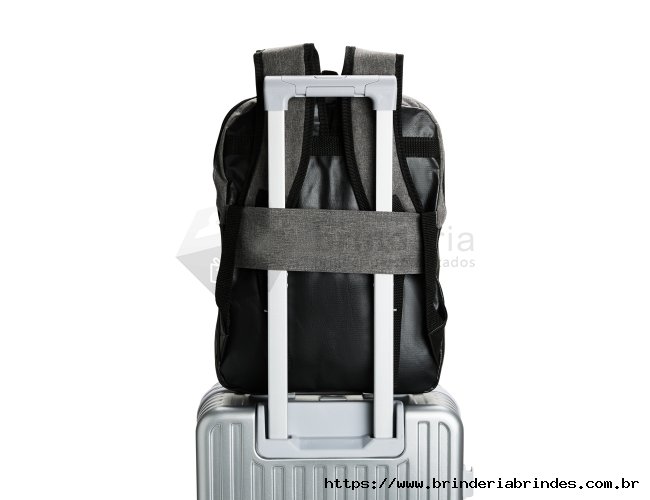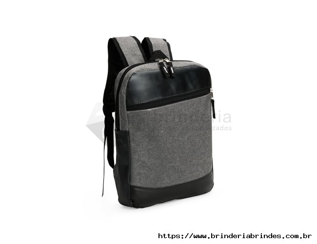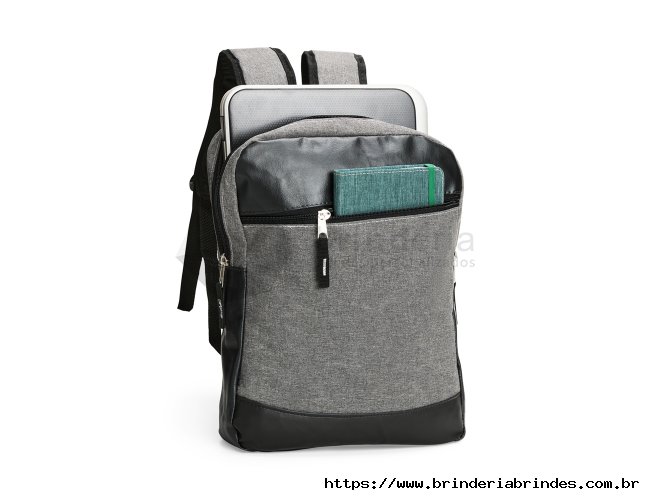 Mochila confeccionada em Poliéster PVC mescla com detalhes em couro sintético e capacidade de até 11 litros. Apresenta divisória interna em tecido telado respirável, ideal para notebooks de até 14 polegadas. Possui compartimento frontal com fechamento em zíper, duas alças para as costas, uma alça de mão e engate posterior para malas de viagem.