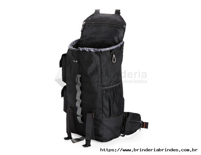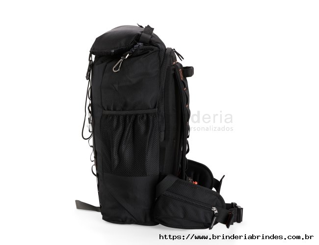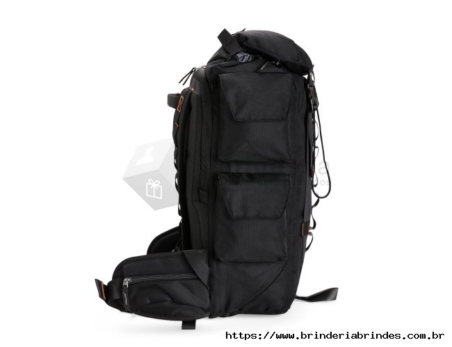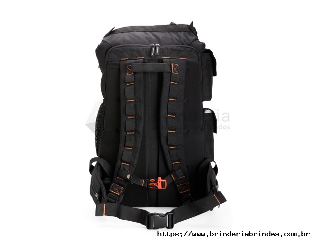 Mochila confeccionada em poliéster impermeável, fechamento por cordão e engate rápido plástico e capacidade máxima de 25 litros. Possui amplo espaço interno com divisória com fechamento em velcro e bolso em tela de nylon próximo à abertura. Apresenta três compartimentos externos: um com fechamento em zíper e dois em velcro nas laterais, além de um bolso lateral em tela de nylon. A parte traseira da mochila conta com outros três compartimentos em diferentes tamanhos, incluindo espaço para notebooks de até 15,6 polegadas.