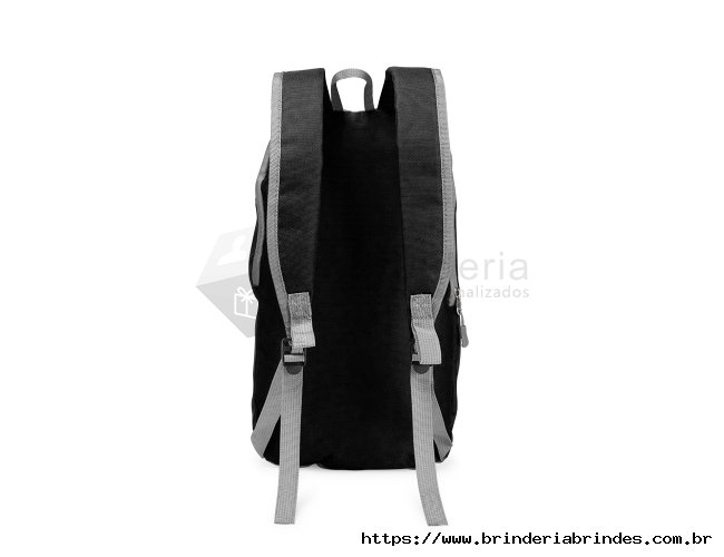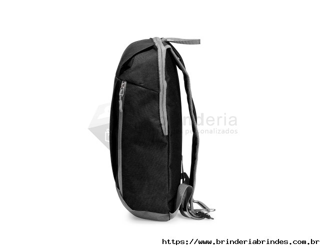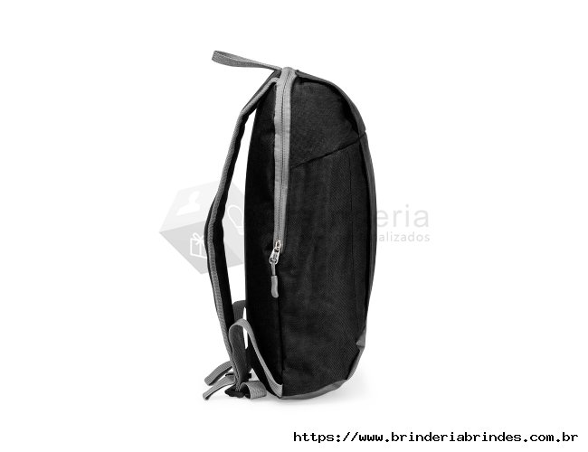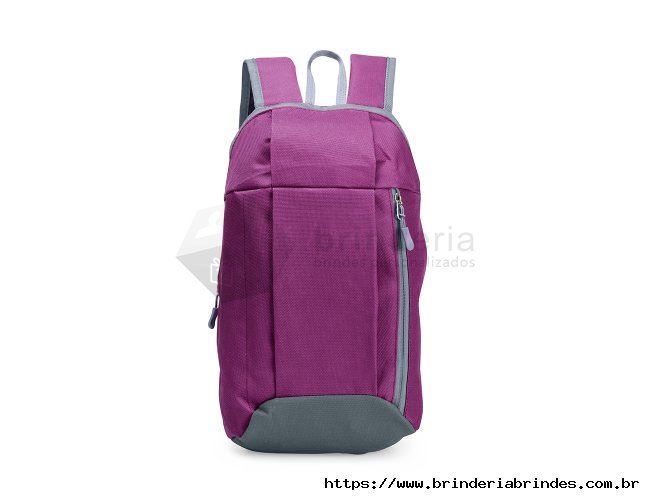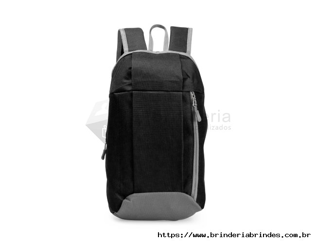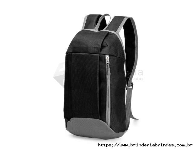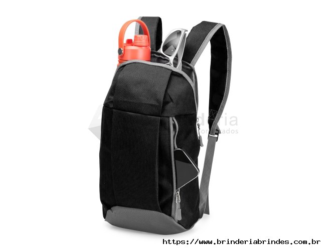 Mochila feita em poliéster impermeável com fechamento em zíper e capacidade para até 9 litros. Possui compartimento interno, um bolso frontal com fechamento em zíper, alça superior em nylon e dois pares de alças traseiras ajustáveis para as costas.
