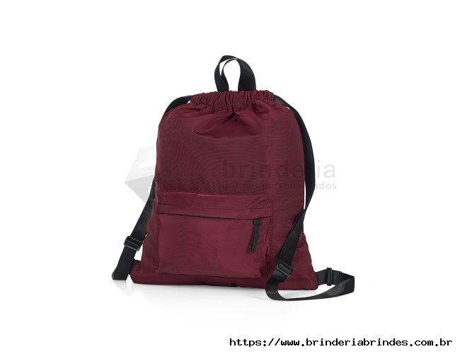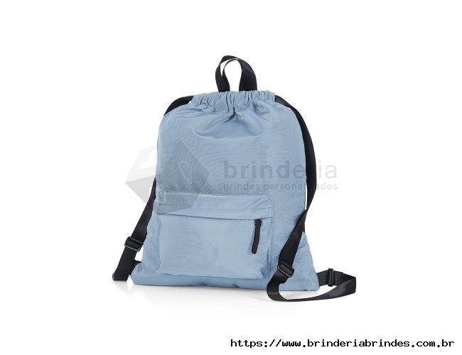 Mochila saco feita em poliéster resistente à água com alças reforçadas de nylon. Possui ainda um bolso frontal com fechamento em zíper.