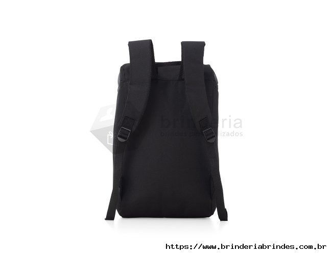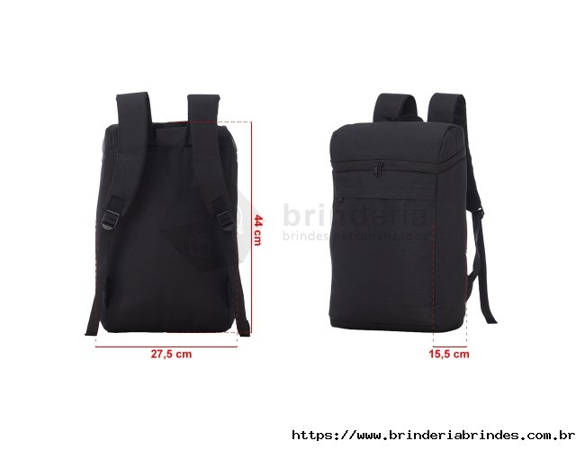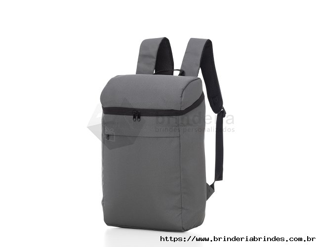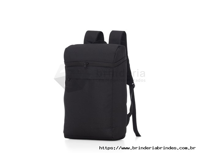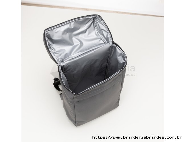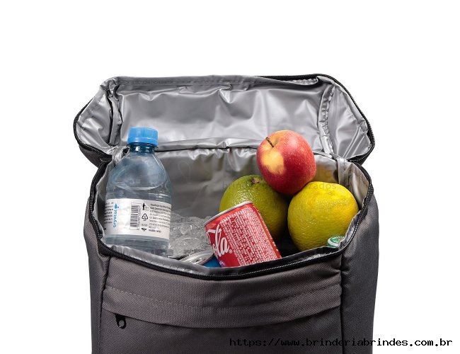 Mochila térmica 17L confeccionada em poliéster, possui bolso frontal com zíper, alça para as mãos em nylon, e alça para as costas ajustáveis com revestimento antitranspirante