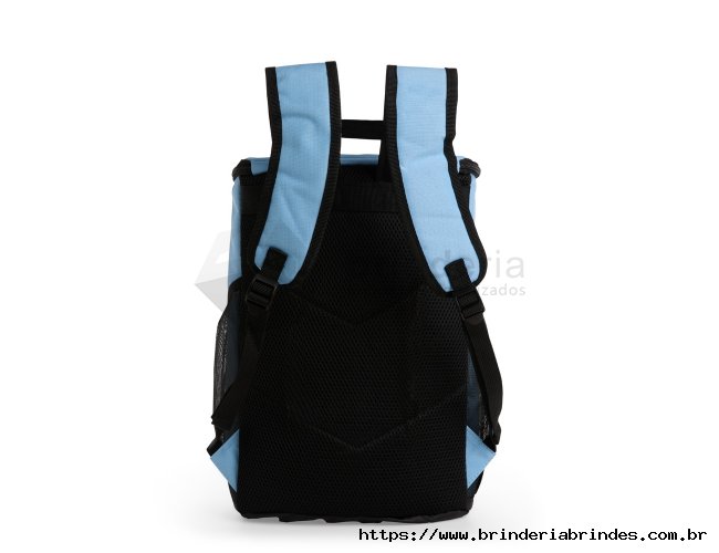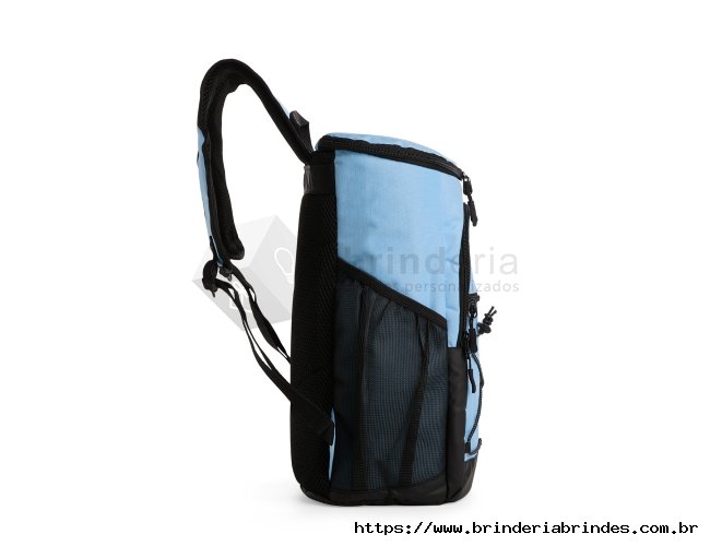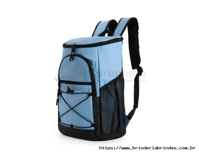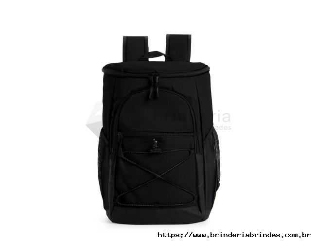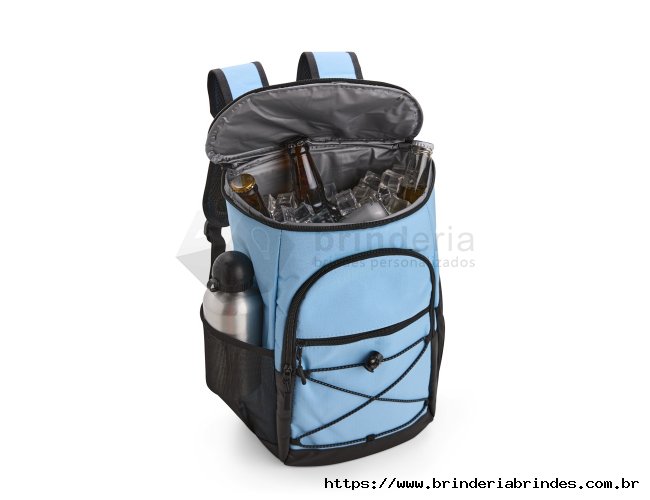 Mochila térmica confeccionada em poliéster impermeável com detalhes em couro sintético e capacidade máxima de 13 litros, distribuída em dois compartimentos revestidos em PEVA: um interno antivazamento e outro, menor, localizado na parte externa. Possui ainda três bolsos externos, incluindo dois em tela de nylon com elástico e um com fechamento em zíper e cordão de elástico ajustável, além de alças e painel traseiro revestidos em espuma respirável.