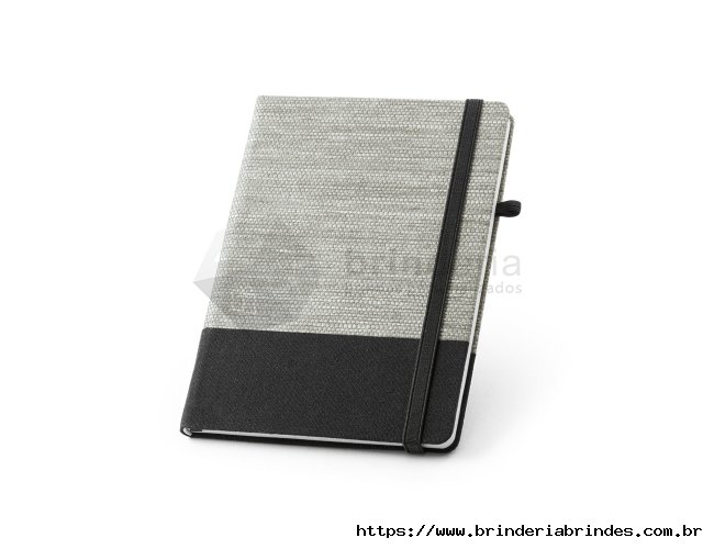 Caderno A5 de capa dura em palha e algodão canvas. Contém 192 páginas pautadas, fita separadora, suporte para esferográfica (não inclusa) e elástico para fecho do caderno. 150 x 210 mm