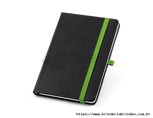 Caderno A5 de capa dura em PU com substrato colorido permitindo a gravação a laser da cor do elástico. Contém 160 páginas pautadas, elástico, fita separadora, suporte para caneta esferográfica (não inclusa) e bolso em papel na parte traseira da capa. 140 x 210 mm